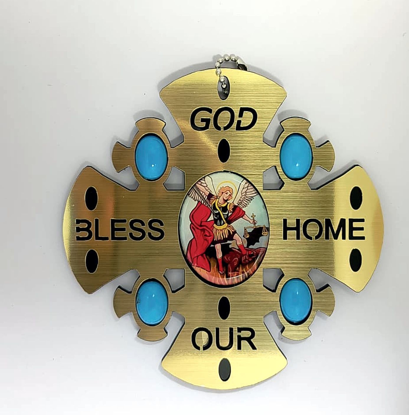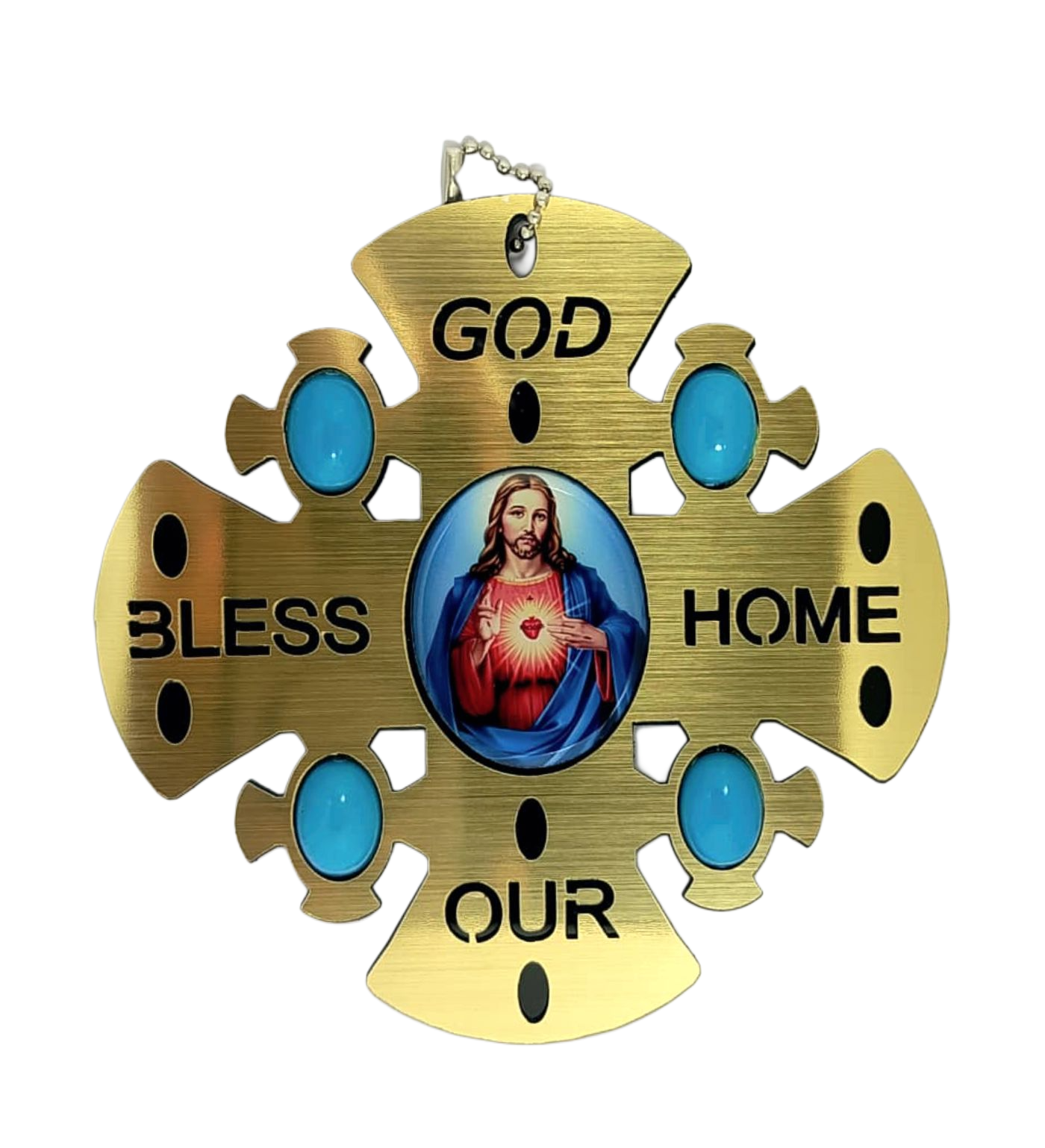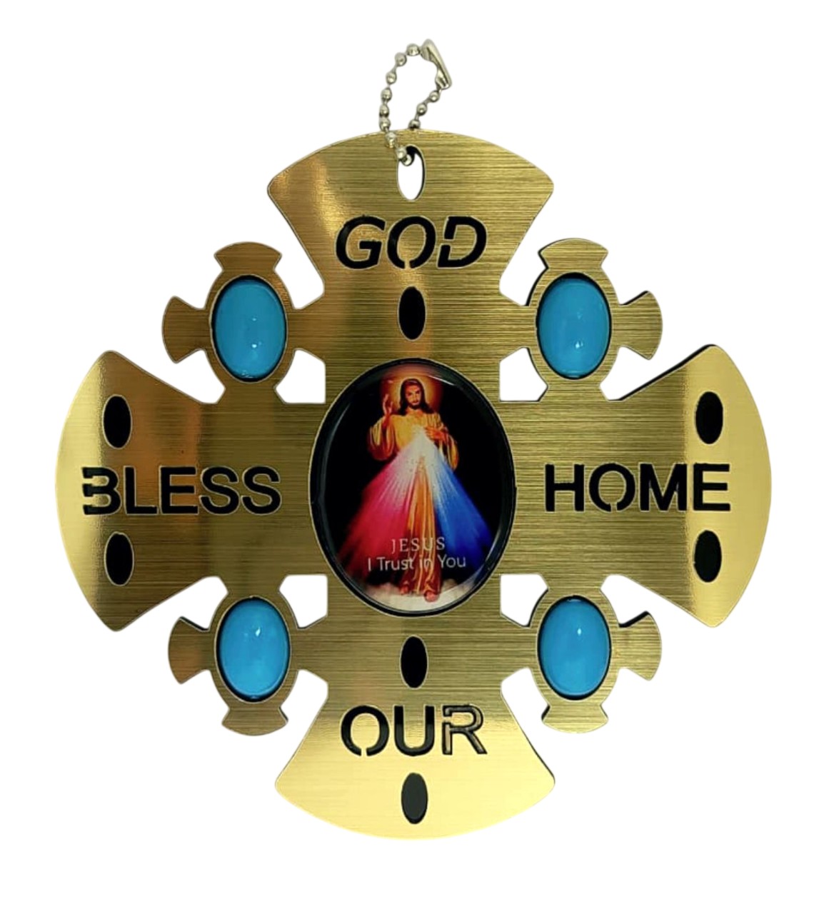 This beautiful ‘God Bless Our Home’ wall hanging cross is a meaningful piece of religious décor that brings faith and warmth into your living space. Featuring a striking cross design with the inspirational words ‘GOD BLESS OUR HOME’ engraved across its arms, this wall hanging serves as a daily reminder of Divine Protection and Blessings. At the centre of the cross is a devotional image of Jesus, creating a focal point for prayer and reflection. The design is elegantly accented with four turquoise-coloured decorative elements positioned at each corner, adding a touch of colour and visual interest to the piece. The cross shape features decorative cutouts that create an intricate, eye-catching pattern. Perfect for displaying in your entryway, living room, bedroom, or prayer room, this religious wall décor makes a thoughtful gift for housewarmings, weddings, or any special occasion. It serves as a beautiful expression of faith whilst enhancing your home’s aesthetic appeal. The compact size makes it suitable for various wall spaces, and it can be easily hung using the attached fixture. Bring spiritual comfort and artistic beauty to your home with this touching religious wall hanging.